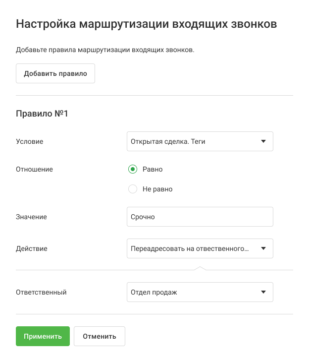 Умная маршрутизация автоматически направляет входящий звонок нужному сотруднику или отделу, используя теги из карточки клиента, компании или сделки, а также учитывает рабочее время. Вы можете гибко настроить маршрутизацию под свои задачи.