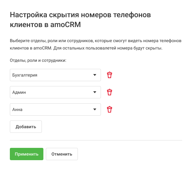 Вы можете скрыть от сотрудников номера телефонов клиентов, чтобы сохранить базу контактов в безопасности, не нарушая рабочий процесс. Номера будут замаскированы с помощью «*”.