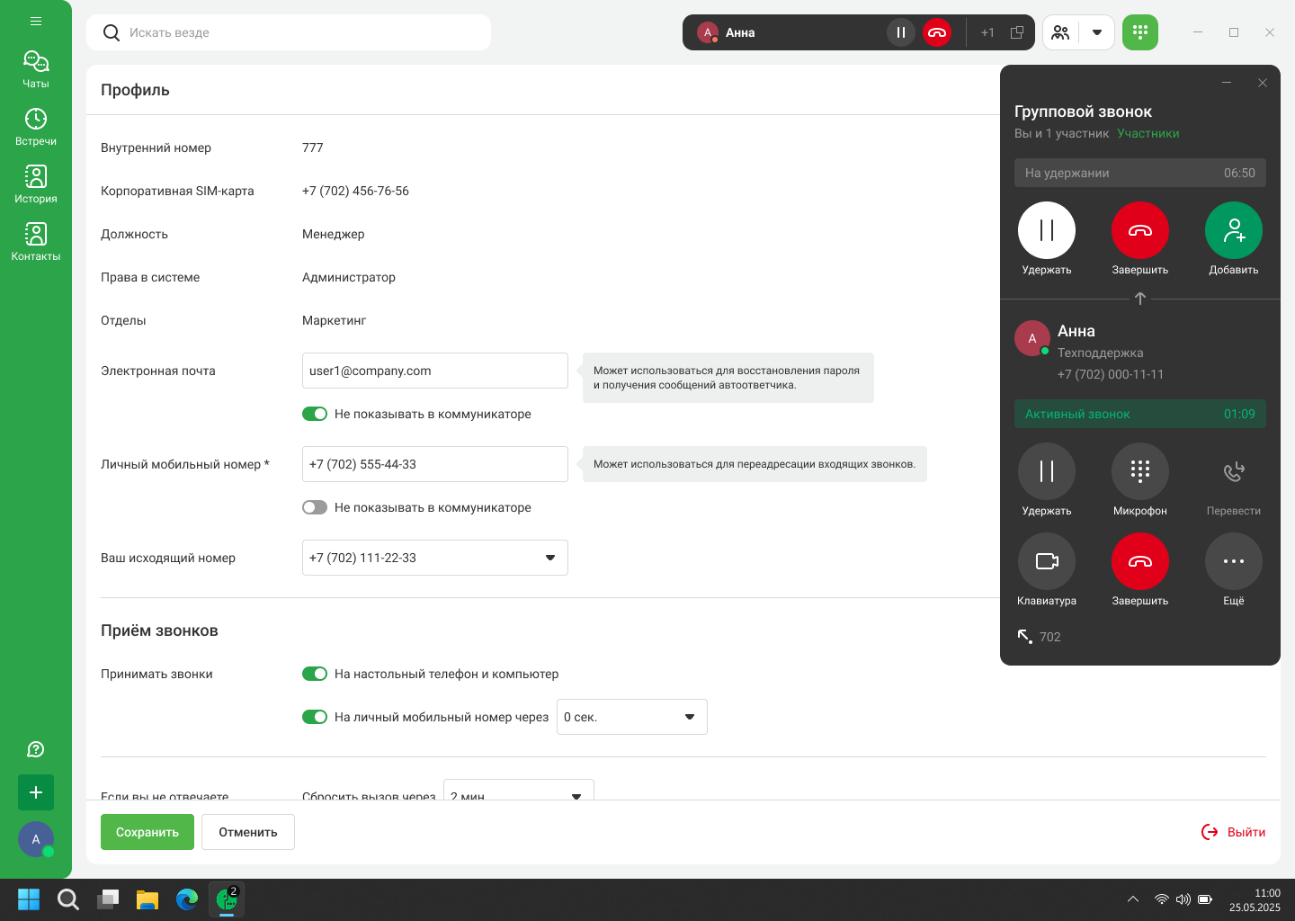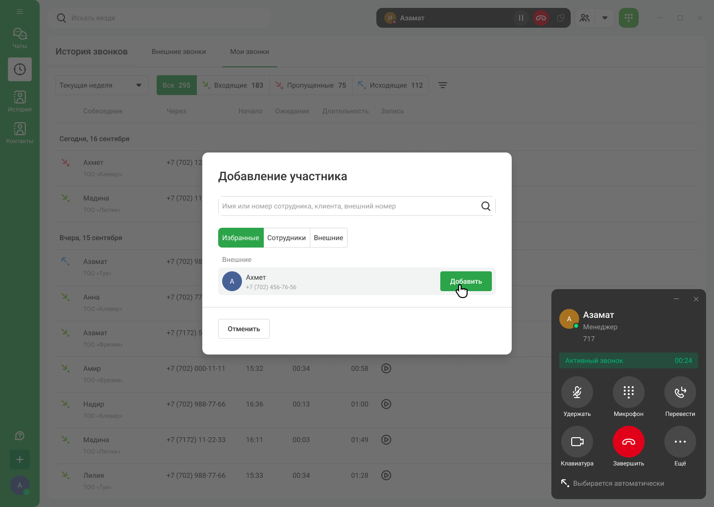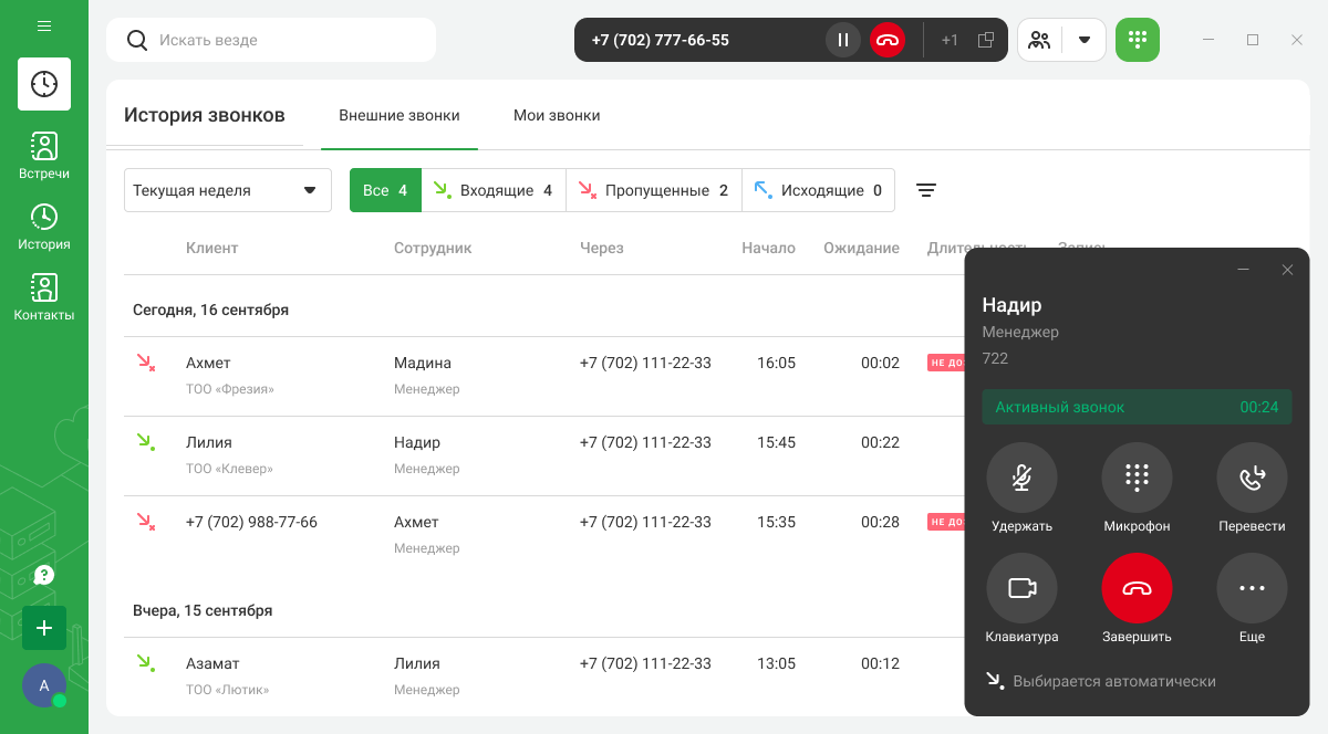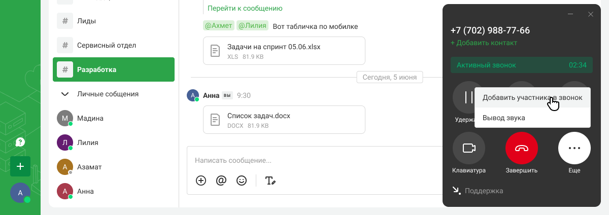 Карточка вызова открывается в отдельном окне, не мешая вам работать с другими приложениями. В карточке звонка доступны все основные функции: удержание, перевод, отключение микрофона, добавление участников в звонок.
