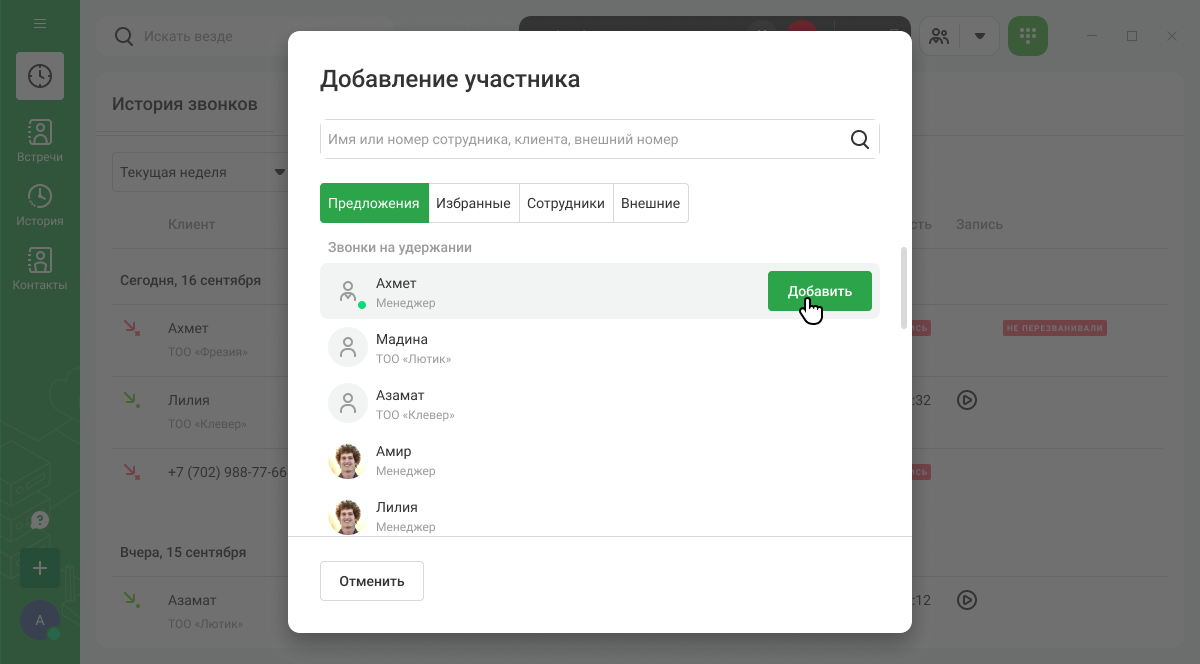 Если у вас есть параллельные вызовы, то при попытке перевода или добавления участников в звонок, они отобразятся на вкладке «Предложения» — так удобнее переключаться между несколькими звонками.