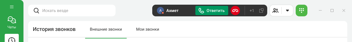 При входящем вызове в мессенджере всплывает карточка с ключевой информацией о контакте: его имя, отдел и номер компании, на который поступил звонок. Так вы сможете обратиться по имени к тому, кто звонит, и быстрее понять контекст обращения. Чтобы принять вызов, нажмите на кнопку «Ответить».