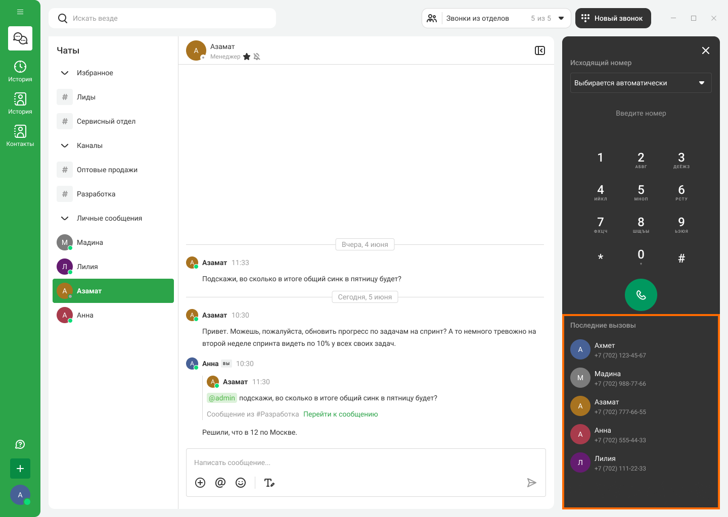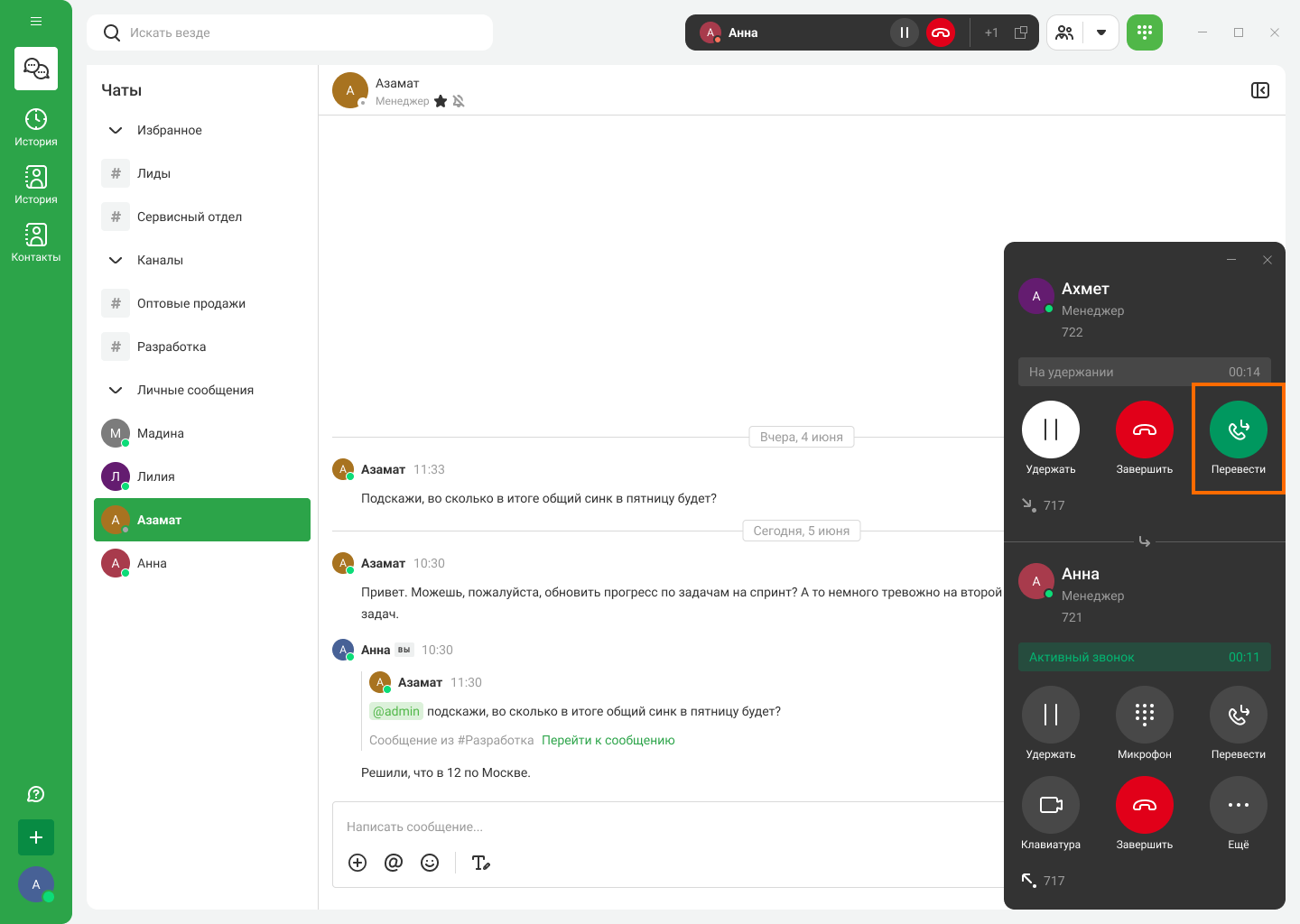 Чтобы узнать, что обсуждалось с этим контактом ранее, нажмите на его имя в верхнем меню или карточке звонка. Если звонит клиент, то откроется его карточка. А если звонит коллега — откроется чат с ним.