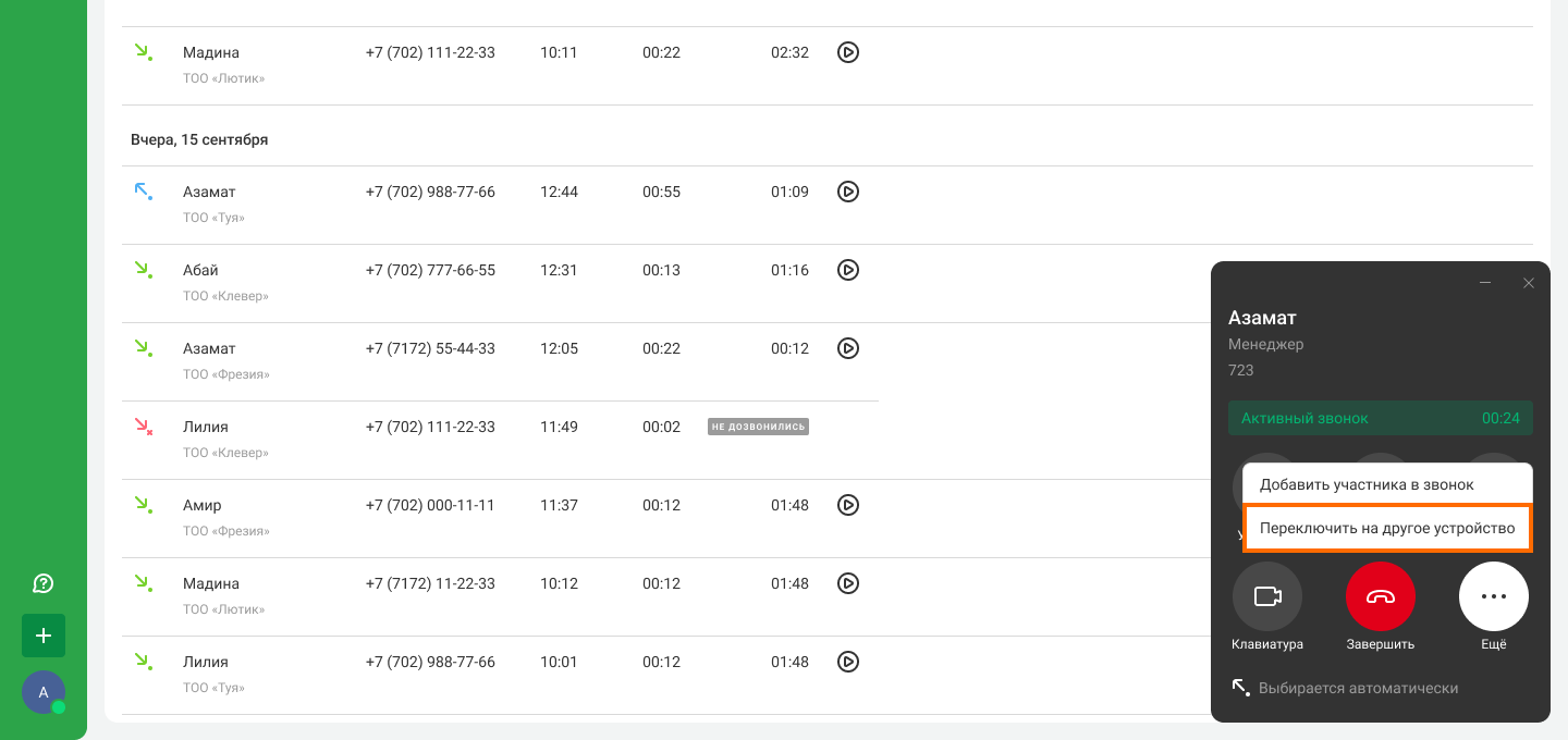 Иногда во время разговора в мессенджере вам нужно покинуть офис. В таком случае можно незаметно для клиента переключить звонок на другое устройство (Call Flip):