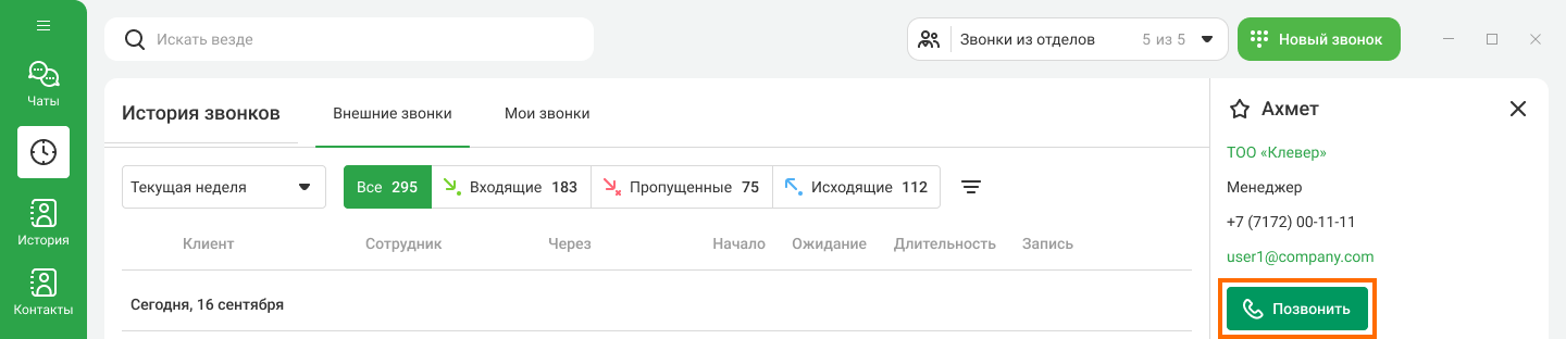 Если у вас пропущенный от клиента и нужно перезвонить как можно скорее, в истории звонков наведите курсор на нужный вызов и нажмите на кнопку «Позвонить» в правой части экрана.