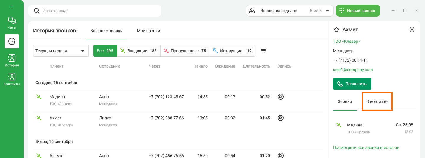 Если у клиента несколько номеров, также из карточки контакта вы можете позвонить на его дополнительный номер. Для этого в карточке перейдите на вкладку «О контакте».