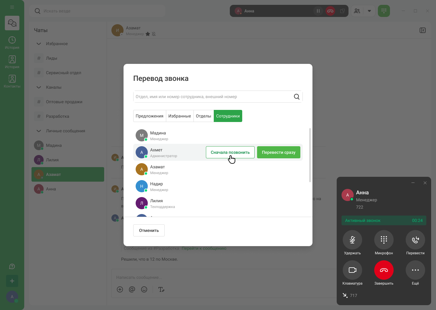 Чтобы перевести вызов, нажмите на кнопку «Перевести» в карточке звонка. Появится окно с вкладками «Отделы» и «Сотрудники». На вкладке «Сотрудники» можно выбрать способ перевода — перевести сразу или сначала позвонить.