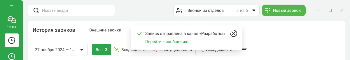 Появится окно с уведомлением об отправке записи — из него вы можете перейти в чат.