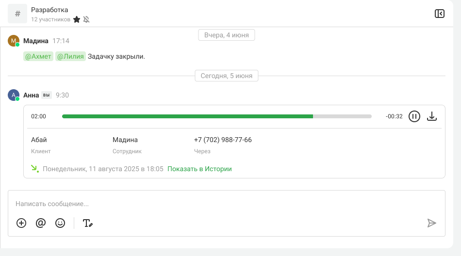 Чтобы поделиться записью звонка в чате, в проигрывателе нажмите на иконку ссылки в правом нижнем углу.
