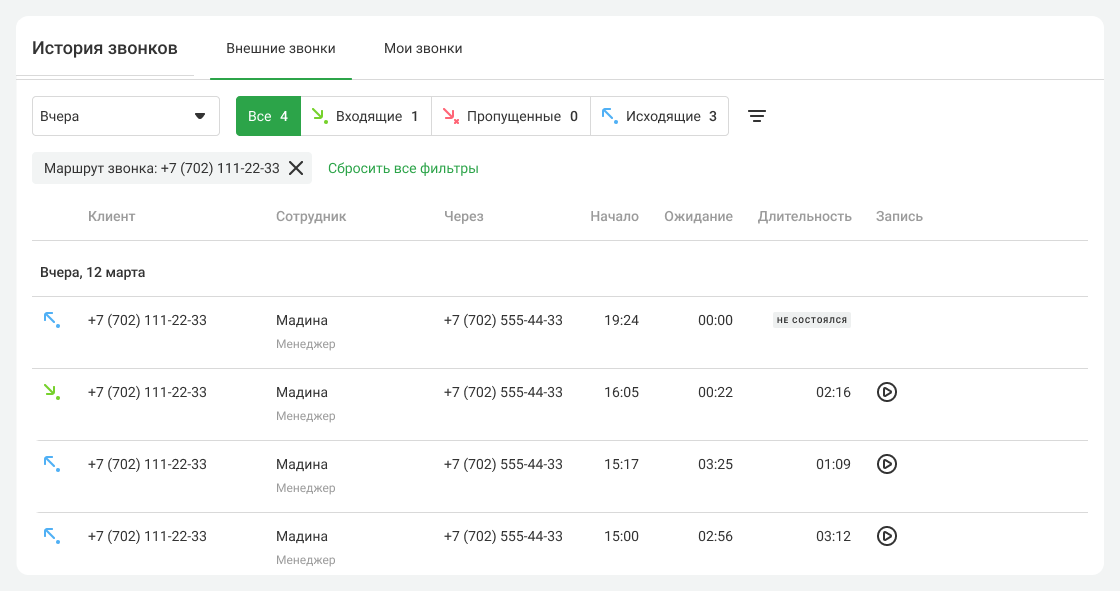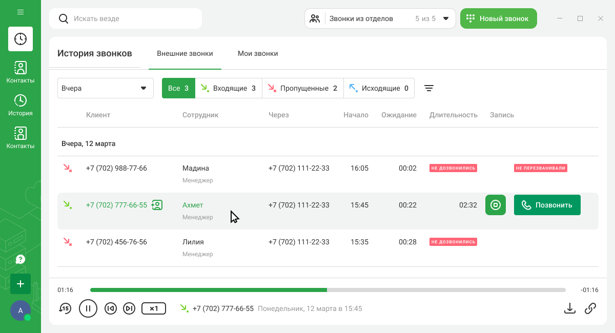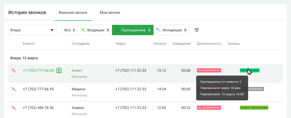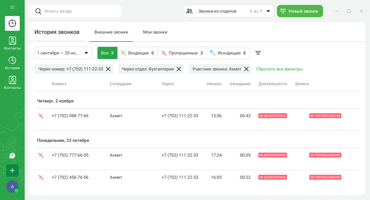 Благодаря фильтру «Контроль пропущенных» вы сможете легко найти непринятые звонки, на которые сотрудники не перезванивали или не дозвонились.
