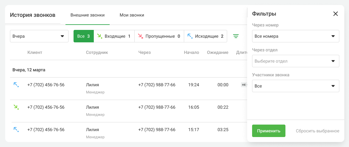 Выберите нужные вам значения фильтров и нажмите «Применить». В таблице останутся только те звонки, которые соответствуют заданным параметрам.