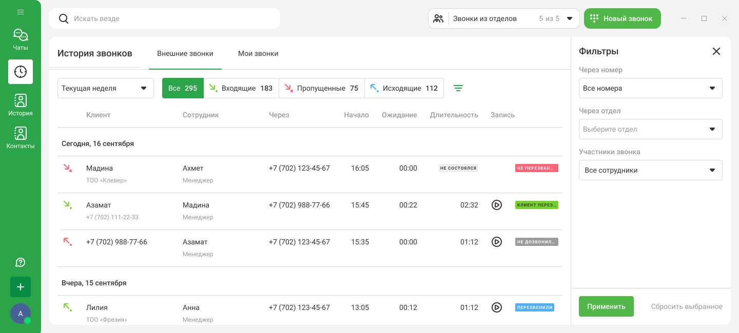 - фильтровать звонки по номерам, отделам, сотрудникам, клиентам и типам вызовов за нужный период;