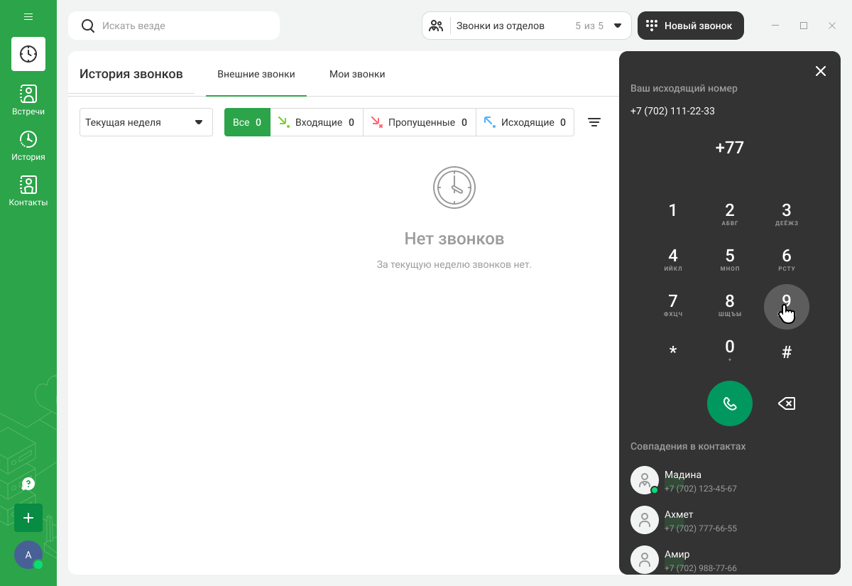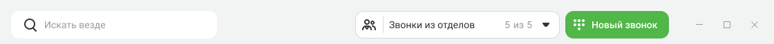 - в верхнем меню — найти нужный контакт или канал, управлять приемом звонков из отделов, в которых вы состоите, а также звонить через панель набора номера.