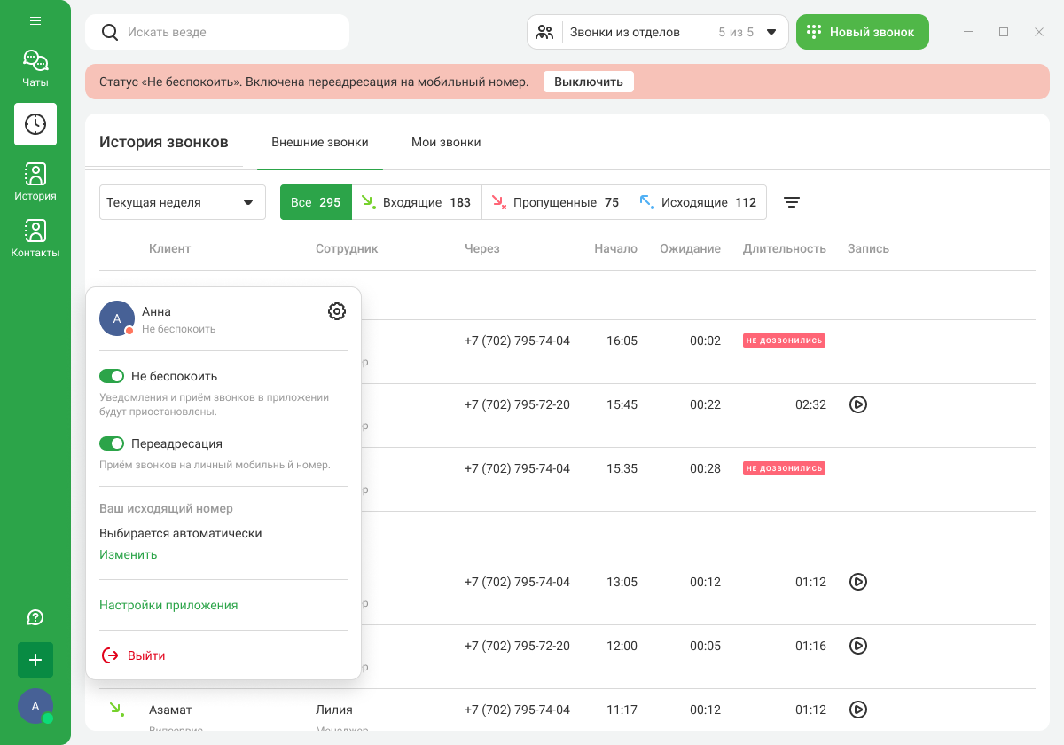 Чтобы временно отключить прием звонков с номеров АТС, в настройках пользователя передвиньте вправо переключатель «Не беспокоить». Статус «Не беспокоить» отобразится вверху экрана. В этом режиме до вас нельзя будет дозвониться: звонки из отделов на вас не будут распределяться, а прямые звонки на внутренний номер и корпоративную SIM-карту при необходимости можно переадресовать на личный мобильный.