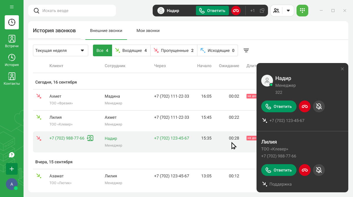 В истории звонков вы сможете узнать больше о контакте и быстро ему перезвонить. Гибкая система фильтров помогает найти любой звонок в архиве и при необходимости прослушать его запись.