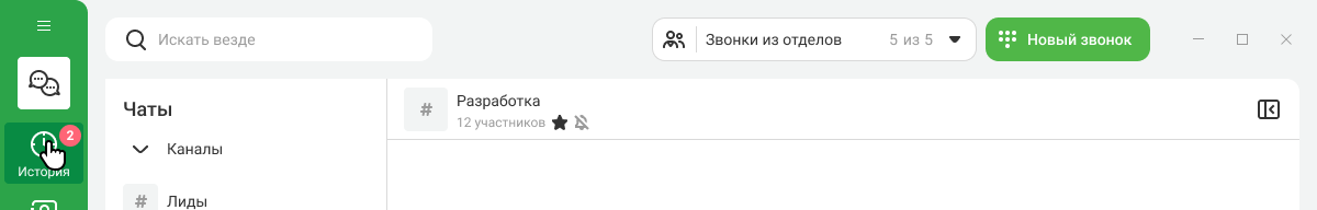 На иконке истории в боковом меню отображается общее число пропущенных звонков, как личных, так и по вашему отделу.