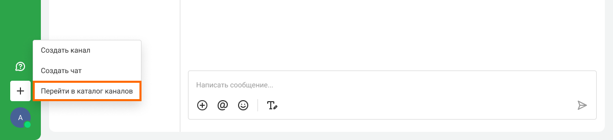 1. Нажмите на иконку плюса в боковом меню. Выберите «Перейти в каталог каналов».