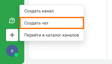 Чтобы начать переписку с коллегой в мессенджере, нажмите на иконку плюса в боковом меню. Выберите «Создать чат».