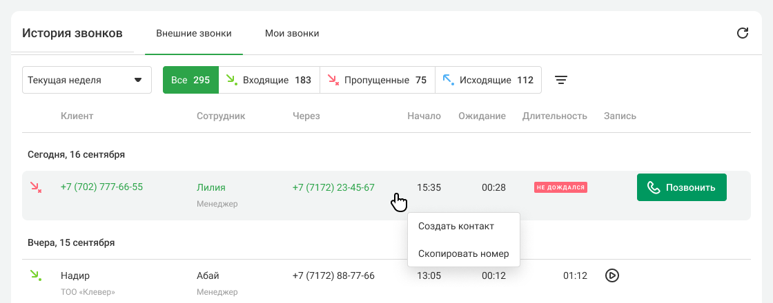 При переходе в историю новый пропущенный звонок подсвечивается красным. Уведомление исчезает, если долго держать вкладку с новым пропущенным открытой или если кто-то из сотрудников перезвонит этому контакту.