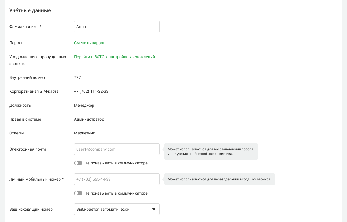 Ниже, в блоке «Учетные данные» можно изменить имя, пароль для входа в АТС, выбрать исходящий номер по умолчанию, добавить личный мобильный для переадресации входящих, а также адрес электронной почты для восстановления пароля и получения сообщений.