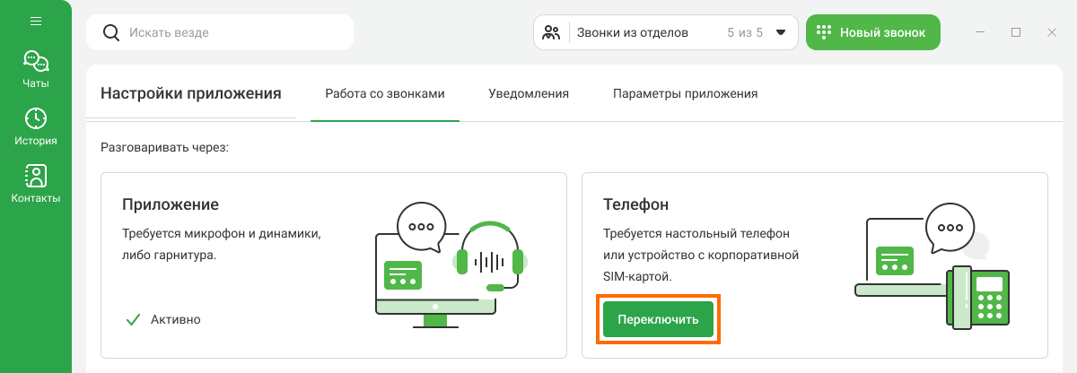 По умолчанию настроен прием и совершение звонков с компьютера. Чтобы принимать входящие звонки в приложении через IP-телефон, можно включить интеграцию через CTI. Для этого нажмите на кнопку «Переключить».