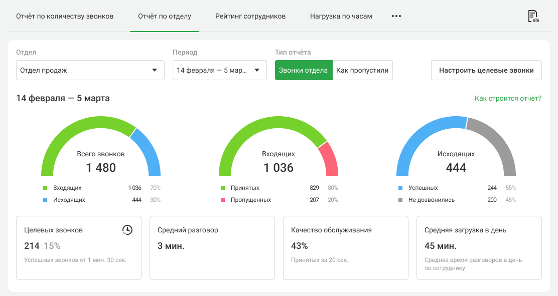 В сводке по всем звонкам можно отслеживать количество звонков, качество обслуживания и средние показатели как по отделу в целом, так и по каждому сотруднику отдела. Также вы можете задать длительность целевых звонков, чтобы оценивать, какая доля вызовов соответствует KPI. Подробнее о том, какие задачи поможет решить этот отчет, — в статье Возможности отчета «Звонки отдела».