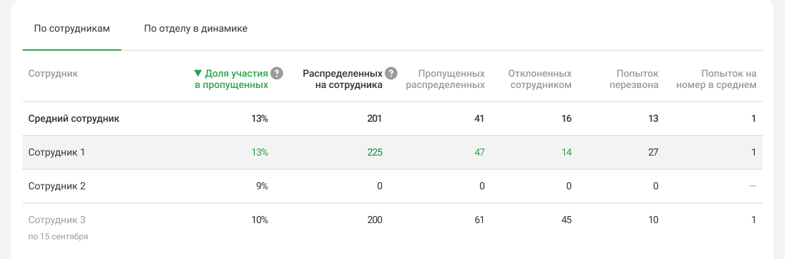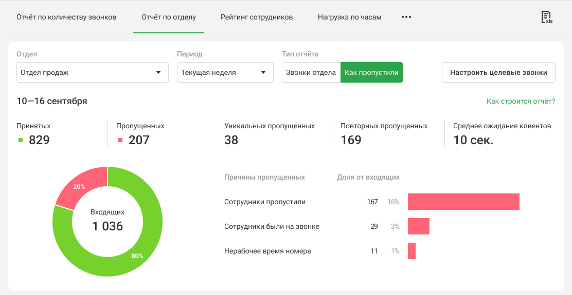 • разбираться, почему звонки в отдел остались без ответа и кто из сотрудников чаще их пропускает.