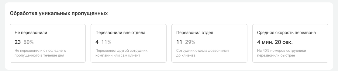 • Перезвонил отдел— какую долю клиентов с пропущенными звонками обработали сотрудники вашего отдела;